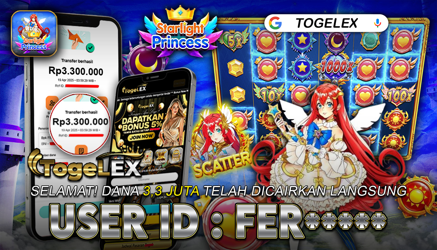 TOGELEX mengucapkan selamat kepada pemilik User ID: FER*** yang berhasil meraih kemenangan besar dalam permainan GATES OF OLYMPUS SUPER SCATTER dengan total kemenangan sebesar Rp 3.300.000. Setelah pemenang mengajukan formulir penarikan dana, proses withdraw berhasil diselesaikan dalam waktu sekitar 5–10 menit, dan dana langsung ditransfer ke rekening yang terdaftar. Bukti transfer yang kami tampilkan merupakan bukti resmi dan valid, sesuai dengan transaksi yang tercatat pada bank tujuan.
